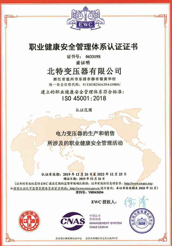 职业健康安全管理体系认证证书